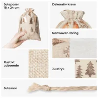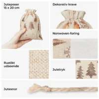 Sæt med 5 juleposer i jute 18x24 cm - rustikke gaveposer med tryk af juletræer