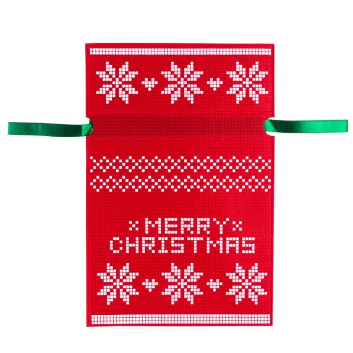 Med trykket "Merry Christmas" på begge sider og grønne satinbånd til lukning fungerer poserne både som praktisk emballage og dekorativt element.