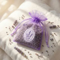 10 stk. Organzaposer til lavendel 9 x 12 cm, mørkelilla med tryk "Lavande de Provence"