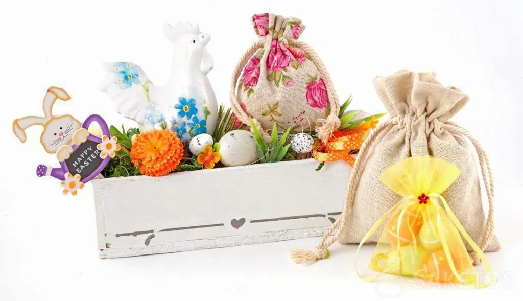 Hvordan pynter du dit hjem til påske på en enkel og effektiv måde? Sækkene er lavet af dekorativt stof og udgør et utroligt dekorativt element, perfekt til indretning med påsketema! Der er mange farvevalg og mange typer stof, så du kan vælge de rigtige sække til enhver indretning! Sække af jute, hør og bomuld passer ind i traditionelle og rustikke dekorationer. Men denimposer eller metalposer er vidunderlige, moderne påskedekorationer. Delikate pasteller og moderigtige neonfarver giver også store kompositionsmuligheder, den eneste begrænsning er vores fantasi! Det er en billig og enkel måde at genopfriske og ændre dit indretningsmønster på!