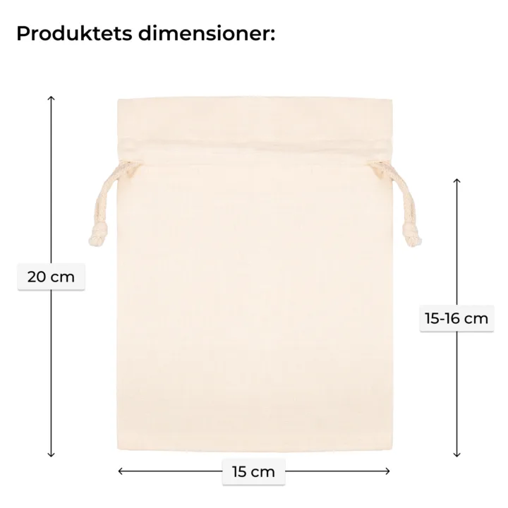 En robust og praktisk bomuldspose på 15 x 20 cm, der er trukket med naturlig snor. Vi sælger 5 stk. i denne serie.