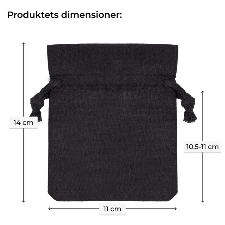 Disse gaveposer er små i størrelsen , men med alsidige anvendelsesmuligheder, og de er lavet af elegant bomuld i sort og måler 11 x 14 cm . Pakken, der præsenteres her, består af 10 stk., så et engangsindkøb af de praktiske poser rækker i lang tid.