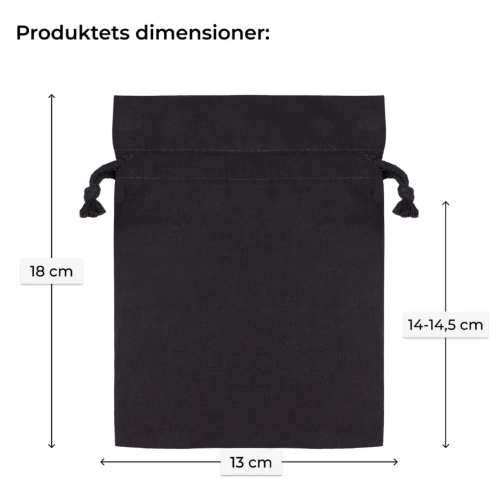 Små, men universelt anvendelige poser af elegant bomuld i sort i størrelsen 13 x 18 cm . Pakken, der præsenteres her, består af 10 stk., så et enkelt køb af de praktiske poser rækker i lang tid.