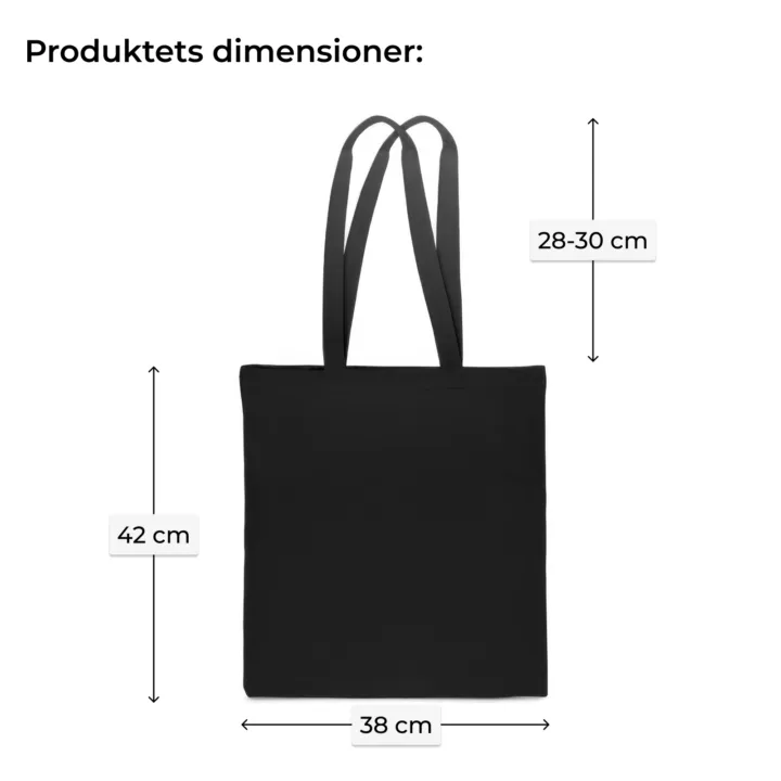 Stor genanvendelig bomuldstaske med målene 38 x 42 cm og en vægt på 140 g skiller sig ud med sin store kapacitet og lange håndtag, hvilket gør den perfekt til daglig brug. Prisen er for 1 stykke - tasker pakkes individuelt. Du kan bestille en stilfuld sort taske uden tryk eller vælge produkttilpasning - tilføj et motiverende citat, en sjov slogan eller navnet på dit yndlingsband.