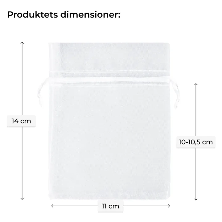 Et sæt små organzaposer i hvid, der måler 11 cm x 14 cm. Denne praktiske pakke indeholder 25 stk., så et enkelt køb er nok til at holde i lang tid.