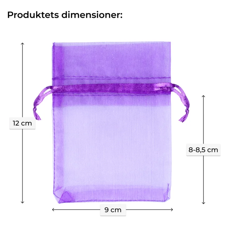 De organzaposer i størrelsen 9 x 12 cm i mørkelilla farve er små, elegante gaveposer, der passer perfekt til lavendel, smykker, kosmetikprøver og små gaver. Sættet indeholder 25 stk., hver med dobbelt satinbånd og en dekorativ kant over løbegangen, som gør poserne enkle at åbne og lukke. Den lette, gennemsigtige struktur fremhæver indholdet og gør dem velegnede både til privat brug og til virksomheder.