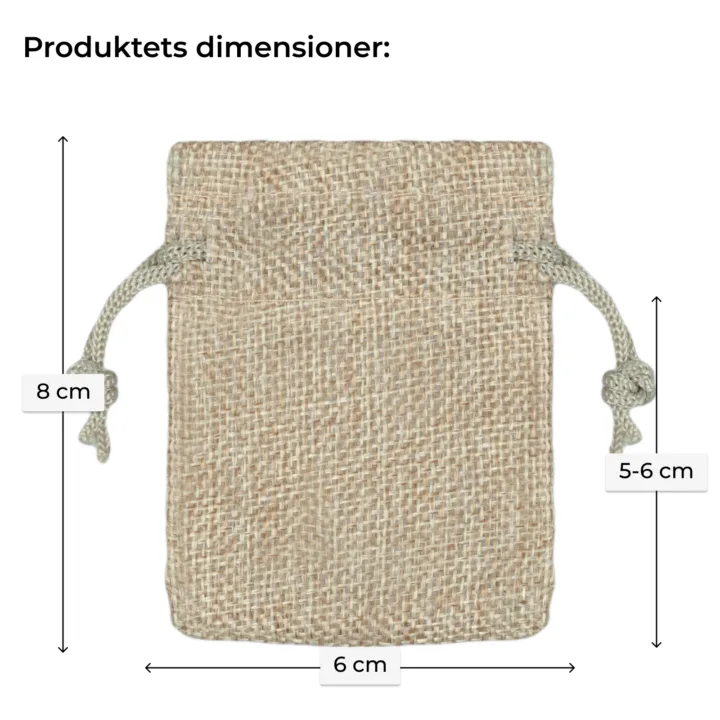 Små, meget alsidige poser af elegant jute i naturlig farve i størrelsen 6 cm x 8 cm. Pakken består af 10 stk., så et enkelt køb kan holde i lang tid.