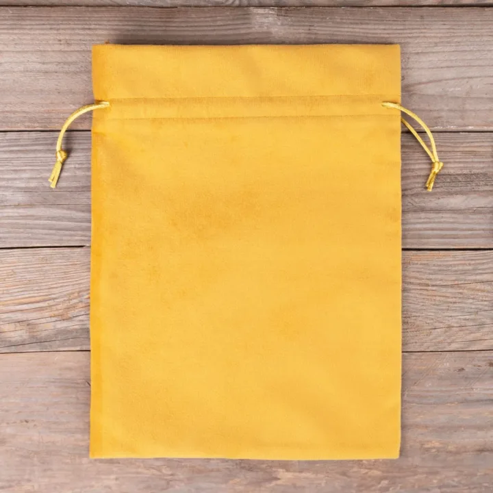 Her kan du købe en pakke med smukke og holdbare velourposer i honningguld farve. Disse poser måler 22 x 30 cm og skiller sig ud med deres trendy udseende og behagelige, bløde stof. Der er 5 stk. poser med snorlukning i pakken.