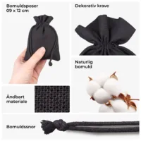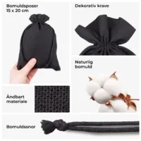 Vores kollektion indeholder sorte bomuldsposer, der kan bruges som elegant emballage til et ur, smykker eller briller. Posen på 16 x 37 cm vil perfekt kunne rumme en flaske hjemmelavet spiritus, vin, likør eller anden spiritus. Spekulerer du på, hvordan du kan opbevare lykønskningskort fra dine bryllupsgæster? Vælg elegante bomuldsposer med snørebånd. Du kan sætte et hvilket som helst tryk på dem, f.eks. dine initialer, bryllupsdato eller ringe. På den måde ved du straks, hvad der er i dem.