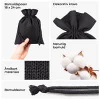 Sorte bomuldsposer kan bruges i ethvert hjem, da de er velegnede til opbevaring af brød, kiks og krydderier. De kan dog også bruges til at opbevare ikke kun madvarer, men også smykker, kosmetik og rejsesouvenirs. Desuden kan de erstatte papirposer og papkasser. For at give poserne et unikt præg er det tilrådeligt at få et personligt tryk på dem. Sørg for, at det relaterer til anledningen eller modtagerens interesser, så du viser dem, at du går op i detaljerne. Du kan også tage genanvendelige bomuldsposer med dig, når du går på indkøb for at reducere brugen af plastikposer.