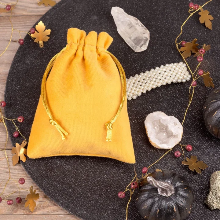 Vi tilbyder en pakke med 10 små velourposer i honninggul farve. Disse poser måler 12 x 15 cm og skiller sig ud med deres trendy udseende og behagelige, bløde stof.